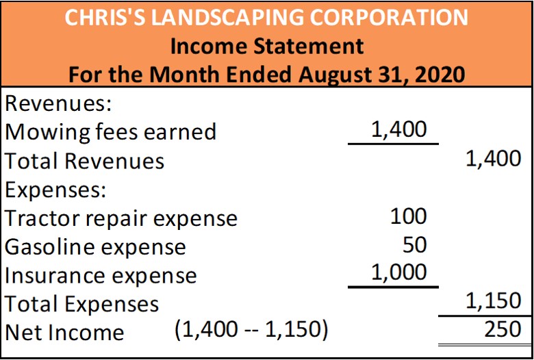 The first financial statement prepared is the income statement, a statement that shows the organization’s financial performance for a given period of time. Let’s illustrate the purpose of an income statement using a real-life example. Assume your friend, Chris,  started a summer landscaping business on August 1, 2020 and decided to organize the business as a corporation. It is categorized as a service entity. To keep this example simple, assume that she is using her family’s tractor, and we are using the cash basis method of accounting to demonstrate Chris’s initial operations for her business. The other available basis method that is commonly used in accounting is the accrual basis method. She is responsible for paying for fuel and any maintenance costs. She named the business Chris’s Landscaping Corporation. On August 31, Chris checked the account balance and noticed there is only $250 in the checking account. This balance is lower than expected because she thought she had been paid by some customers. Chris decides to do some research to determine why the balance in the checking account is lower than expected. Her research shows that she earned a total of $1,400 from her customers but had to pay $100 to fix the brakes on her tractor, $50 for fuel, and also made a $1,000 payment to the insurance company for business insurance. The reason for the lower-than-expected balance was due to the fact that she spent ($1,150 for brakes, fuel, and insurance) only slightly less than she earned ($1,400)—a net increase of $250. While she would like the checking balance to grow each month, she realizes most of the August expenses were infrequent (brakes and insurance) and the insurance, in particular, was an unusually large expense. She is convinced the checking account balance will likely grow more in September because she will earn money from some new customers; she also anticipates having fewer expenses.