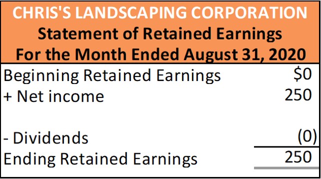 In our example, to make it less complicated, we started with the first month of operations for Chris’s Landscaping Corporation. In the first month of operations, Retained Earnings begins the month of August 2020, at $0, since there have been no transactions. During the month, the business earned revenue of $1,400 and incurred expenses of $1,150, for net income of $250. Since the business did not make any distributions of assets to owners, the ending balance in the Retained Earnings account on August 31, 2020, would be $250.