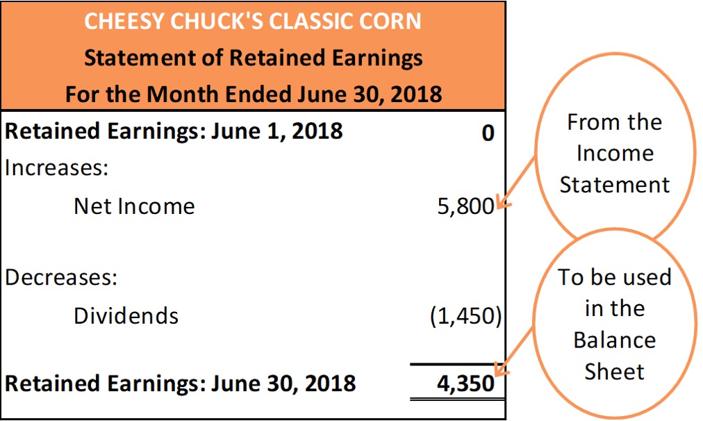 Let’s create the statement of retained earnings for Cheesy Chuck’s for the month of June. Think of retained earnings as a pot where we combine 3 of the 4 things that affect equity. Equity (leftover assets) is increased when the business receives assets from owners (contributed capital) and when it earns (revenues). Equity is decreased when the business incurs expenses and when it distributes assets to owners (dividends). We will combine earnings, expenses, and distributions to owners (dividends) in the Retained Earnings pot. (Contributed capital — when the business receives assets from owners — is kept separate, but is still important!)